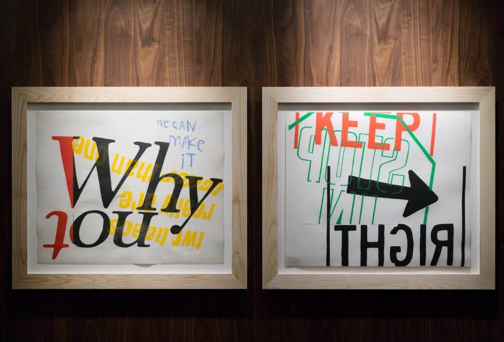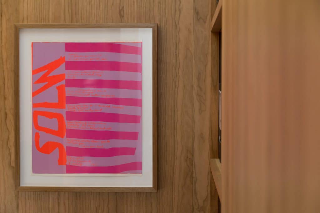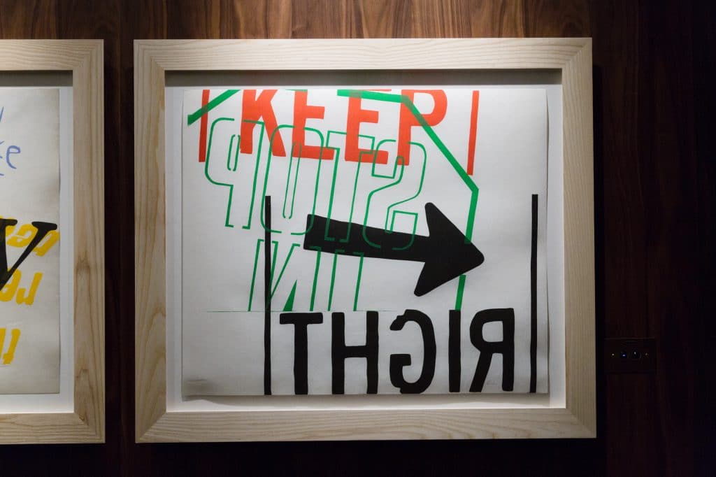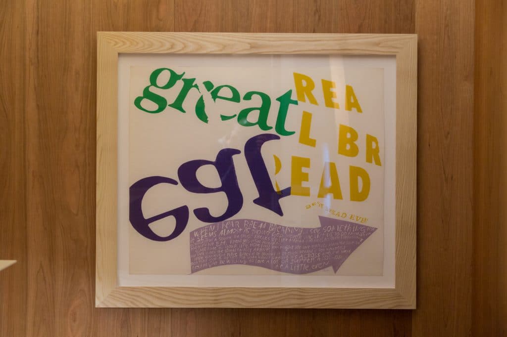 The 11 pieces currently on display as a part of the Paramount by The Office Space collection were all painted between 1965 and 1973. These vibrant serigraphs represent Kent’s spirituality but interestingly her commitment to social justice, her hope for peace and a general delight in the world around her. Built up from popular culture, the works use grocery store signage, texts from scripture, song lyrics and writing from literary greats such as Gertrude Stein, E.E. Cummings and Albert Camus.