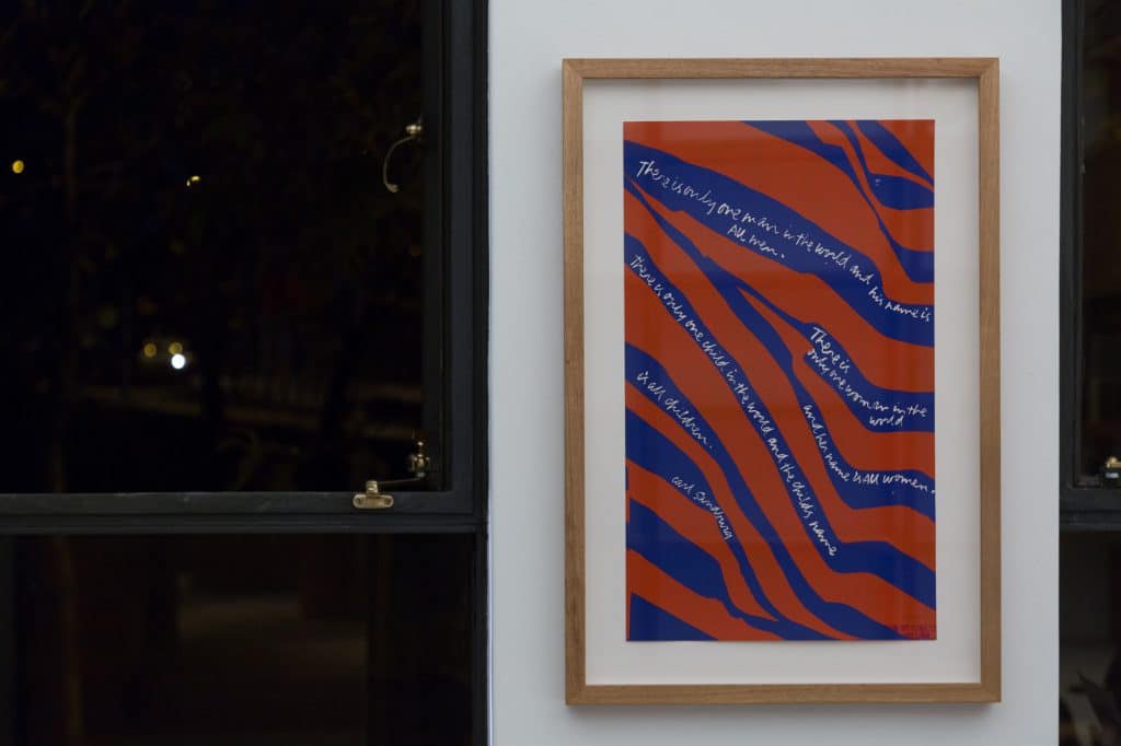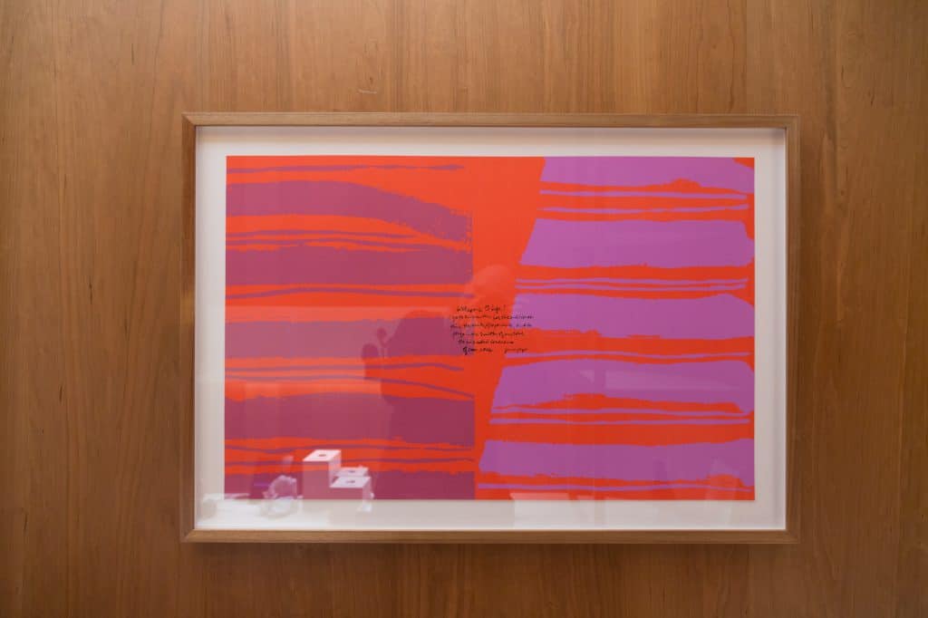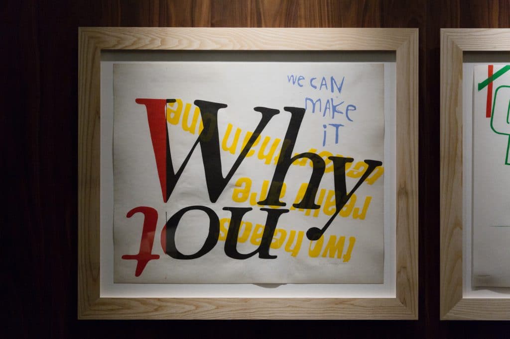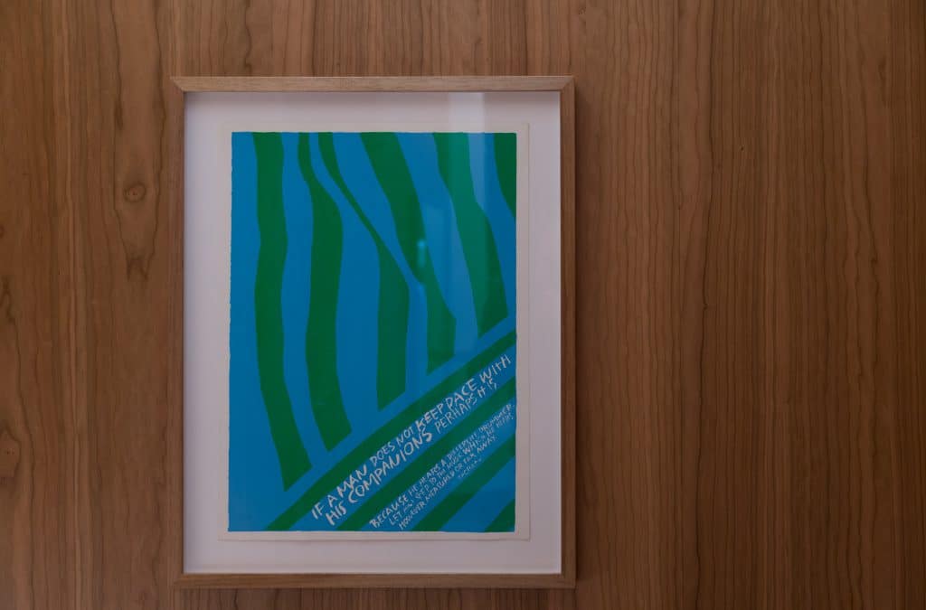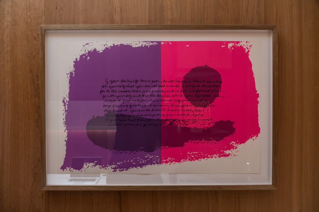 The 11 pieces currently on display as a part of the Paramount by The Office Space collection were all painted between 1965 and 1973. These vibrant serigraphs represent Kent’s spirituality but interestingly her commitment to social justice, her hope for peace and a general delight in the world around her. Built up from popular culture, the works use grocery store signage, texts from scripture, song lyrics and writing from literary greats such as Gertrude Stein, E.E. Cummings and Albert Camus.