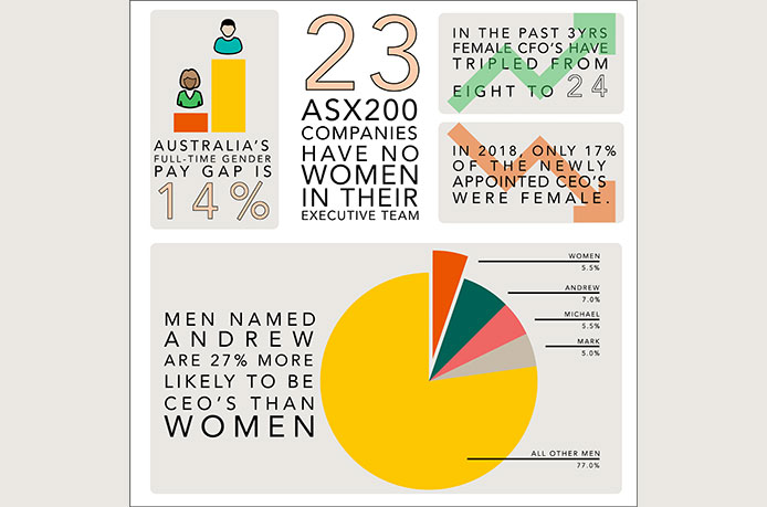 Similarly, we haven’t yet achieved equal representation of women in corporate leadership and executive positions. And why not? According to the Credit Suisse Research Institute “companies with more female executives in decision-making positions continue to generate stronger market returns and superior profits.” Australia is considered one of the best in the National Geographic’s Inclusion index and is positioned as a leader across Asia for diversity with our record high numbers of women in ASX200 directorships. Female ASX200 CFO’s have tripled in the past three years to 24 now. There’s progress, but unfortunately there’s also regress. Only 12 companies have a female CEO down from 14 in 2018, that’s just 7% of the ASX200. And out of the 23 newly appointed CEO’s in 2018 only 4 were women. In 2019, men named Andrew were 27% more likely to be ASX200 CEO’s than women. Executive teams average 22.25% female, which is only up from 20% in 2010. And there are 23 ASX200 companies with no women in their executive teams at all. Australia’s slow pace of achieving equal representation of women in leadership is stagnating progress. Gaining positions of leadership is a means for women to be seen and heard on their own terms.